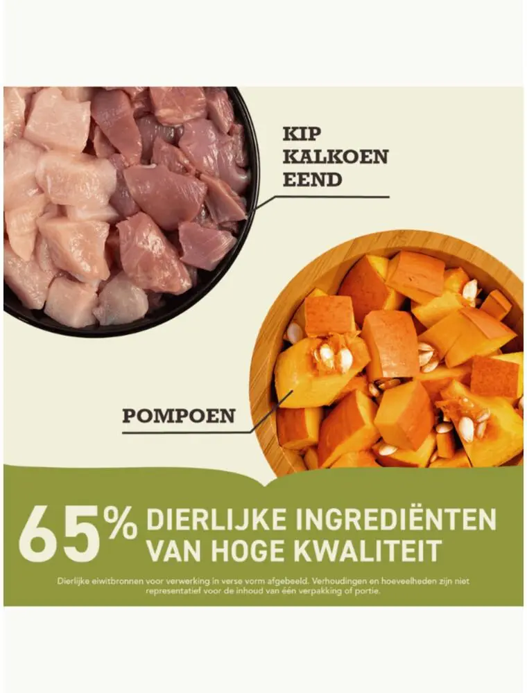 Verse kip (17%), kippenvlees meel (16%), kalkoenvlees meel (13%), havergrutten, hele erwten, kippenvet (7%), hele groene linzen, hele kikkererwten, hele rode linzen, verse eieren (4%), rauwe kalkoen (4%), linzenvezel, visolie (1%), rauwe eend (1%), verse kippeningewanden (lever, hart, spiermaag) (1%), rauwe kalkoenlever (1%), gedroogde kelp, verse hele flespompoen, verse hele pompoen, hele veenbessen, hele bosbessen.