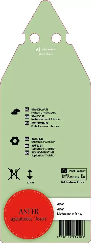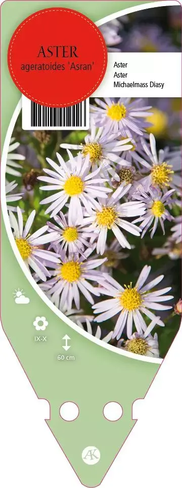 De vaste plant Aster Ageratoides Asran (Herfstaster) is een zomerbloeier. Plant de Aster Ageratoides Asran op een plek met zon en plaats maximaal 7 planten per vierkante meter. Deze plant heeft een maximale hoogte van 60 cm als volwassen plant. De bloemkleur is blauw.