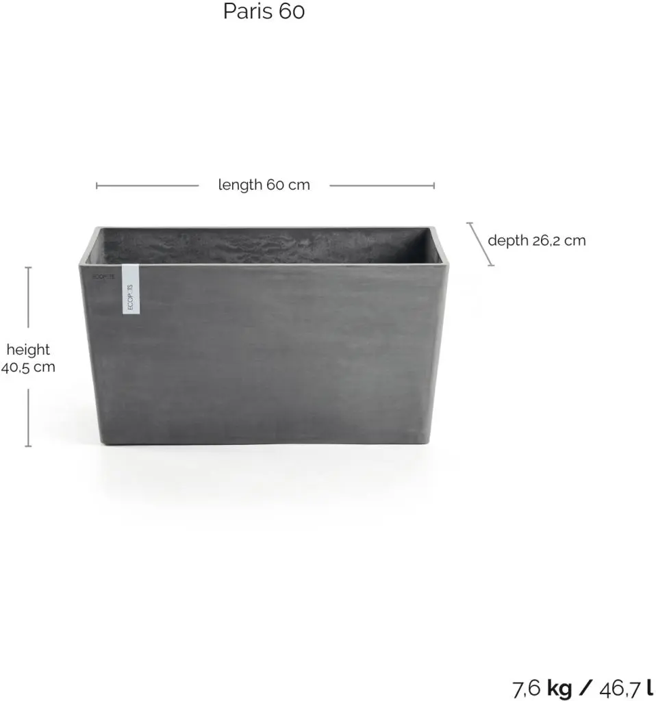 De Ecopots Paris 60 (Grijs) brengt een rustige, steenachtige uitstraling in een compacte rechthoekige plantenbak. Ideaal voor balkons, terrassen of langs de gevel. Vervaardigd uit duurzame gerecyclede materialen.