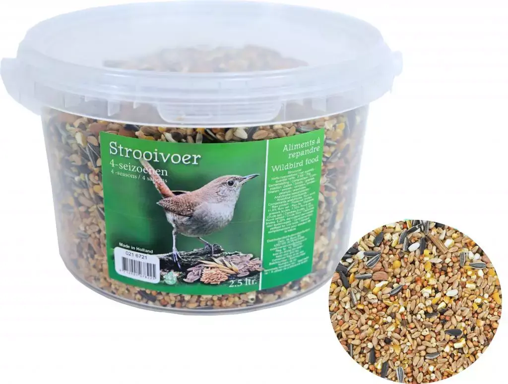 Strooivoer 4-seizoenen emmer a 2.5 liter geeft u de mogelijkheid om het gehele jaar te genieten van de vogeltjes in uw tuin. Het strooivoer 4-seizoenen voer is een uitgekiend mengsel van zaden en pitten om de buitenvogel iets extra's te bieden als zij het nodig hebben. Het strooivoer 4-seizoenen voer zit verpakt in een hersluitbare emmer.