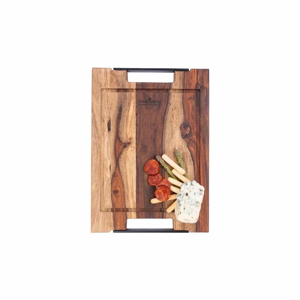 Pure rose wood steakplank sapgoot en handvatten 35 x 25 cm van Bowls and Dishes is een rechthoekige serveerplank van Rose Wood hout. De plank is voorzien van een sapgoot en twee zwarte metalen handvatten, wat zorgt voor een opvallende en praktische uitvoering.