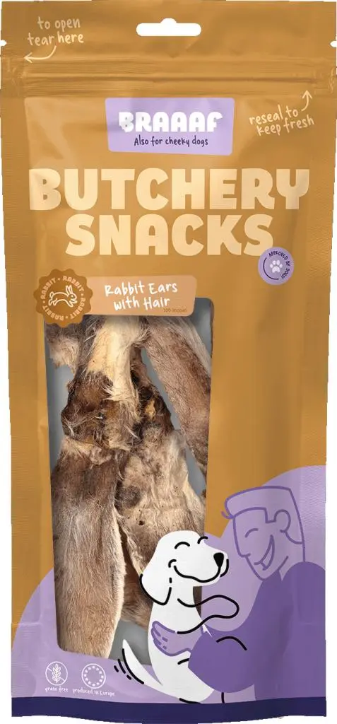 Ook jouw hond houdt van kauwen! De Braaaf Konijnenoren met Haar zijn dé ultieme snack om aan deze behoefte te voldoen. Het haar op de oren fungeert als een natuurlijke flos, helpt tanden en tandvlees gezond te houden én draagt bij aan een schone darmwerking. Bovendien is deze snack hypoallergeen, waardoor het perfect is voor honden met een gevoelige maag of tijdens een eliminatiedieet. • 100% natuurlijk kwaliteitsvlees uit Europa. • Volledig graanvrij, net als alle andere Braaaf producten. • Ideaal tijdens een eliminatiedieet. • Doordat de haren werken als een natuurlijke flosdraad kan deze snack bijdragen aan een gezonde gebitsverzorging. • Ondersteunt een gezonde darmflora en spijsvertering. • Vers en hygiënisch verpakt.