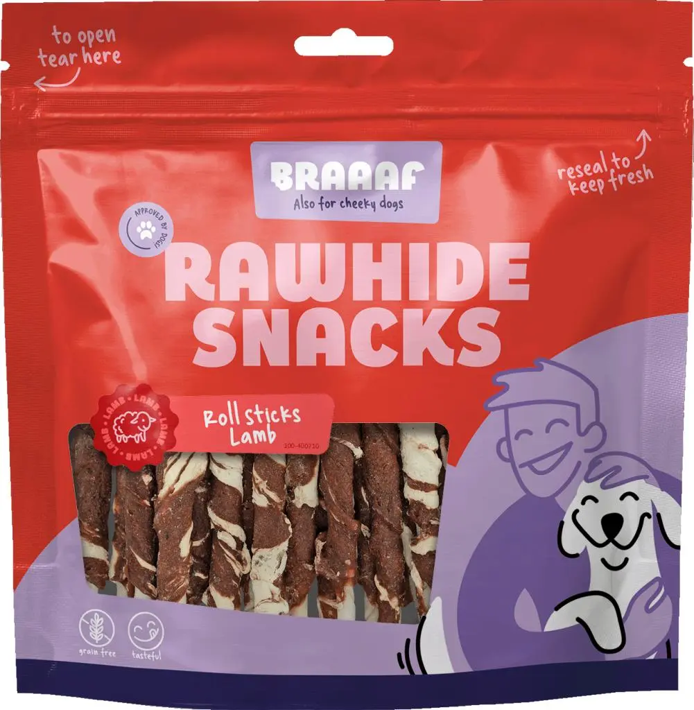 Een lekkere snack die helpt het gebit van je hond sterk en schoon te houden. Dat zijn de runderhuid snacks van Braaaf. Een kauwproduct met gedroogd vlees eromheen. Niet alleen nuttig en gezond, maar ook erg lekker. In verschillende smaken als rund, kip, lam en eend. Zo zit er voor iedere hond wel iets bij. Ook is het goed om regelmatig te variëren. Dat geeft een extra stimulans om goed te kauwen. Met de Roll Sticks Lam heb je altijd een lekkere snack in huis. De snacks zijn graanvrij, waardoor ze ook geschikt zijn voor honden met een gevoelige maag. De snacks zijn van hoogwaardige kwaliteit en hebben een hoge acceptatiegraad. Al onze producten zijn vers en hygiënisch verpakt. Kauwsnacks zijn goed voor het gebit en adem. Jouw trouwe viervoeter verdient toch ook alleen de beste kauwsnacks?