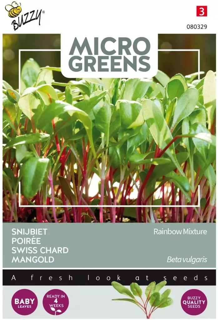 Dit kleurrijke mengsel is oogstbaar na ongeveer 4 weken als babyleaf. Snijd de bladeren bij het oogsten boven het groeipunt af, hierdoor kunt u vaak nog een tweede keer oogsten. Heerlijk in salades en bij winterse gerechten. Microgreens zijn groenten en kruiden, die je in een jong stadium oogst en rauw eet, te verdelen in twee groepen; Micro leaves: oogst en eet zowel het kiemblad als de stengel; de kiem. Baby leaves: oogst de scheuten en eet het jonge blad. Zaaien: strooi de zaden op grond en bedek ze met een dun laagje aarde, houd deze vochtig.