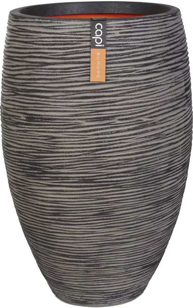 Deze prachtige nature elegant deluxe rib nl in de kleur antraciet heeft een diameter van 56 cm en is 85 cm hoog. De bijzondere ribstructuur geeft een natuurlijke look en speelse touch aan deze bloempotten. De grote Capi Nature Rib vaas is beschikbaar in zachte aardse kleuren en past in elk soort interieur. Ook in je tuin of op je terras zou deze designpot zeker niet misstaan. Het sterke kunststof, lijkend op natuursteen, maakt dat de bloempot onbreekbaar, kleurvast en vorstbestendig is. Daarom geeft Capi Europe maar liefst een 10-jaars garantie op de bloempot!