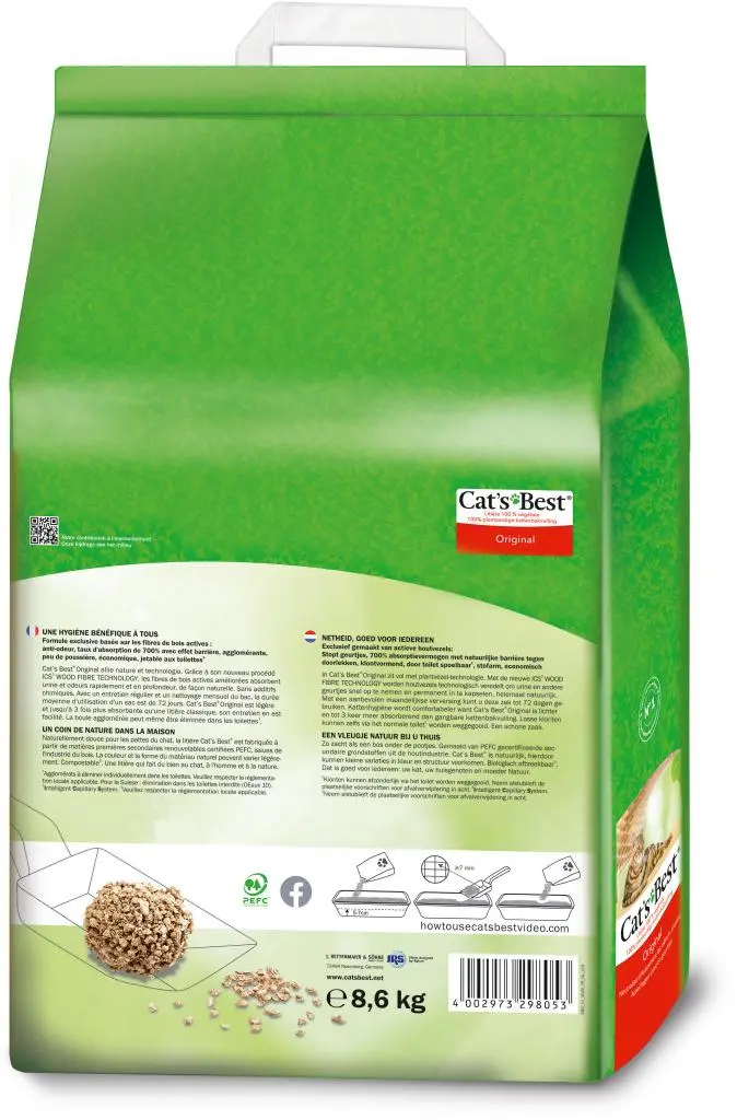 Een klontvormende kattenbakvulling met de natuurlijke kracht van verfijnde actieve houtvezels. Vocht en geuren worden bijzonder effectief geabsorbeerd en ingekapseld. De vezels kunnen tot wel zeven keer hun eigen volume opnemen. De klonten kunnen eenvoudig verwijderd worden. Zo kan de vulling tenminste 5 weken in de bak blijven voordat deze volledig verschoond hoeft te worden.