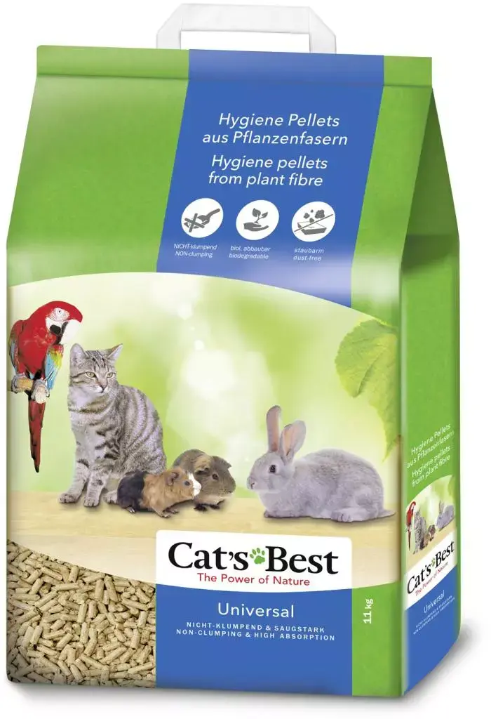 Cat’s Best Universal is een veelzijdige, biologisch afbreekbare pellet-bodembedekker die ideaal is voor zowel kattenbakken als kleine knaagdieren- en vogelverblijven. De pellets zijn gemaakt van natuurlijke plantaardige vezels en staan bekend om hun uitstekende absorptievermogen. Hierdoor wordt vocht snel opgenomen en worden nare geurtjes effectief verminderd.