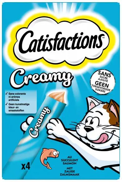 Kom dichter bij je kat met een traktatie waar ze dol op is. CATISFACTIONS® Creamy Snacks hebben een crèmige textuur en zijn ontworpen om uit de hand te kunnen geven. Eenvoudig uit het zakje te knijpen. Te voeren met de hand, te voeren in een kom, of te gebruiken als een topping. Een speciale ervaring waar je kat en jij dol op zullen zijn! - Met zalige zalmsmaak - Zonder toegevoegde suikers - Zonder kunstmatige kleur- en smaakstoffen - Met taurine - Doos kan worden gerecycled