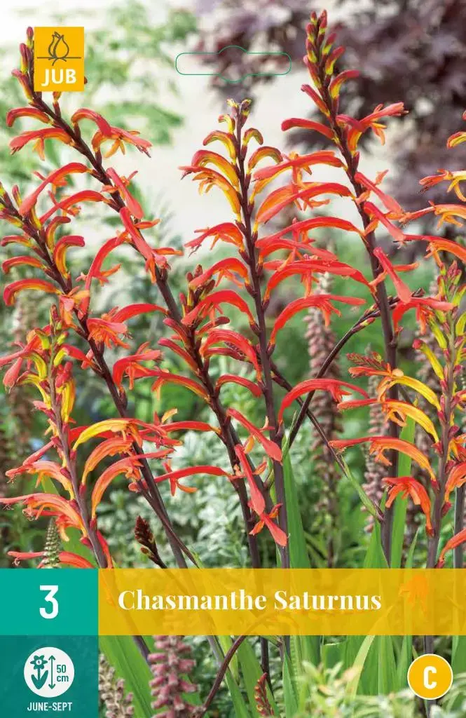 Chasmanthe 'Saturnus' heeft zijn oorsprong in Zuid-Afrika. De bol vormt lange smalle zwaardvormige bladeren waaruit een lange bloemstengel groeit. De bloem bestaat uit lange buisvormige kleinere bloemen. Deze kleinere bloemen staan in verticale rijen aan weerszijden van de steel. Chasmanthe houd van goed doorlaatbare zandgrond. Ze zijn niet helemaal winterhard en moeten daarom binnen overwinteren op een droge warme plaats. Na half mei, kunnen de bollen weer geplant worden op een zonnige plek in de tuin of in een pot.