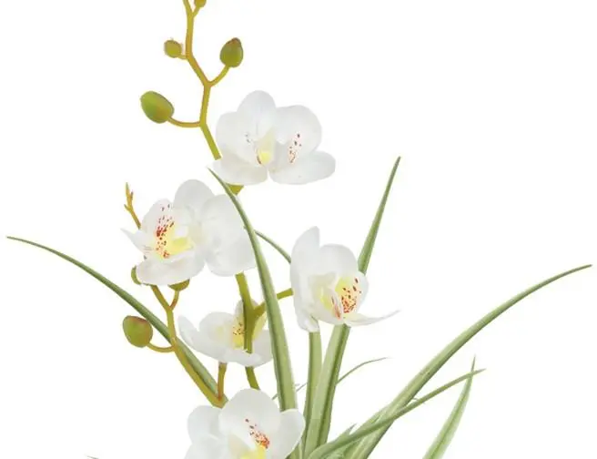 Deze kunst Phalaenopsis mini in wit heeft verfijnde, transparante bloemblaadjes met een zachte gele en roze kern. Smalle bladeren en kleine groene accenten geven het ontwerp een frisse, natuurlijke uitstraling. De betonlook pot versterkt het lichte en moderne karakter. Het kunststof materiaal blijft vormvast en onderhoudsvrij. Een subtiele, elegante toevoeging voor minimalistische en frisse interieurs. Lengte = 8 / Breedte = 9 / Hoogte = 34cm