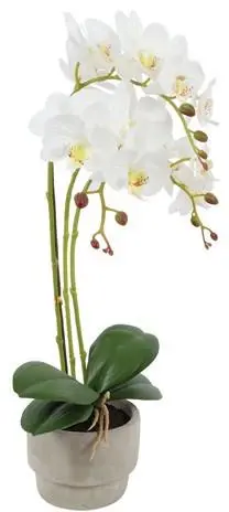 Deze witte kunst Phalaenopsis heeft zachte, transparante bloemblaadjes met een subtiele gele kern voor een frisse, elegante uitstraling. De glanzende groene bladeren en fijne wortels creëren een natuurlijk geheel. De betonlook pot geeft een moderne en rustige basis. Het kunststof materiaal zorgt voor een blijvend verfijnde look. Een tijdloos decorstuk voor lichte en minimalistische interieurs. Lengte = 15 / Breedte = 25 / Hoogte = 56cm