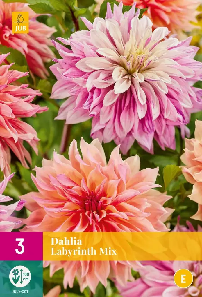 De dahlia mix Labyrinth Mix is een dankbare zomerbloeier die u maandenlang plezier geeft. Dahlias bloeien de hele zomer van juli tot de eerste nachtvorst. Deze dahlias worden ongeveer 100 cm. hoog. Soms is het nodig om de bloemstengels te steunen. Dahliaknollen kunt u in het voorjaar planten. Dahlias zijn vorstgevoelig, pas dus wel op met late nachtvorst. Graaf een ruim plantgat, maak de aarde los en vul het plantgat met goede potgrond. Leg de knollen voorzichtig in het plantgat en dek af met 3-5 cm. aarde. De plantafstand van de knollen is 30-60 cm. Geef na het planten de knollen meteen wat water. Dahlias bloeien het rijkst in de volle zon. Bewaar de knollen na de bloei op een vorstvrije plaats en u heeft er jarenlang plezier van. dahlias zijn goed te combineren met vaste planten en andere dahlia soorten. De bloemen zijn echte blikvangers in de border. Dahlias zijn ook uitstekende snijbloemen en lang houdbaar op de vaas. Het beste tijdstip om dahlias te snijden is vroeg op de dag. Zet de stelen direct in lauwwarm water met snijbloemenvoedsel.