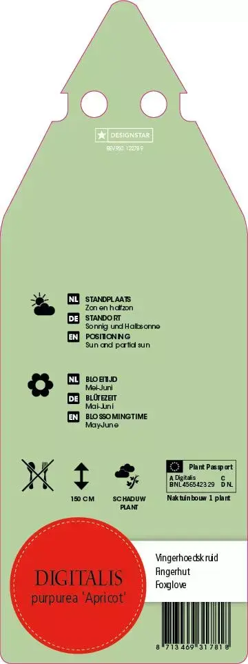 De vaste plant Digitalis Purpurea Apricot (Vingerhoedskruid) is een zomerbloeier. Plant de Digitalis Purpurea Apricot op een plek met zon, halfschaduw en plaats maximaal 5 planten per vierkante meter. Deze plant heeft een maximale hoogte van 1,25 m als volwassen plant. De bloemkleur is roze.