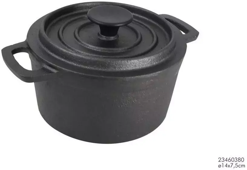 Zware kwaliteit gietijzeren braadpan van 14 cm, geschikt om te bakken, braden en sudderen. Gietijzer heeft een optimale warmtegeleiding, maar mag je nooit snel verhitten.