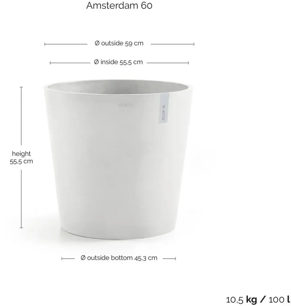 De Ecopots Amsterdam 60 (Puur Wit) is een royale, ronde bloempot met een frisse en moderne uitstraling. Perfect voor grotere planten en kleine boompjes, zowel binnen als buiten. Handgemaakt van duurzame, gerecyclede materialen.