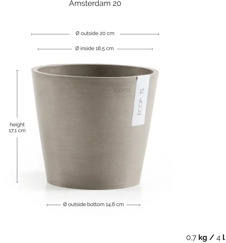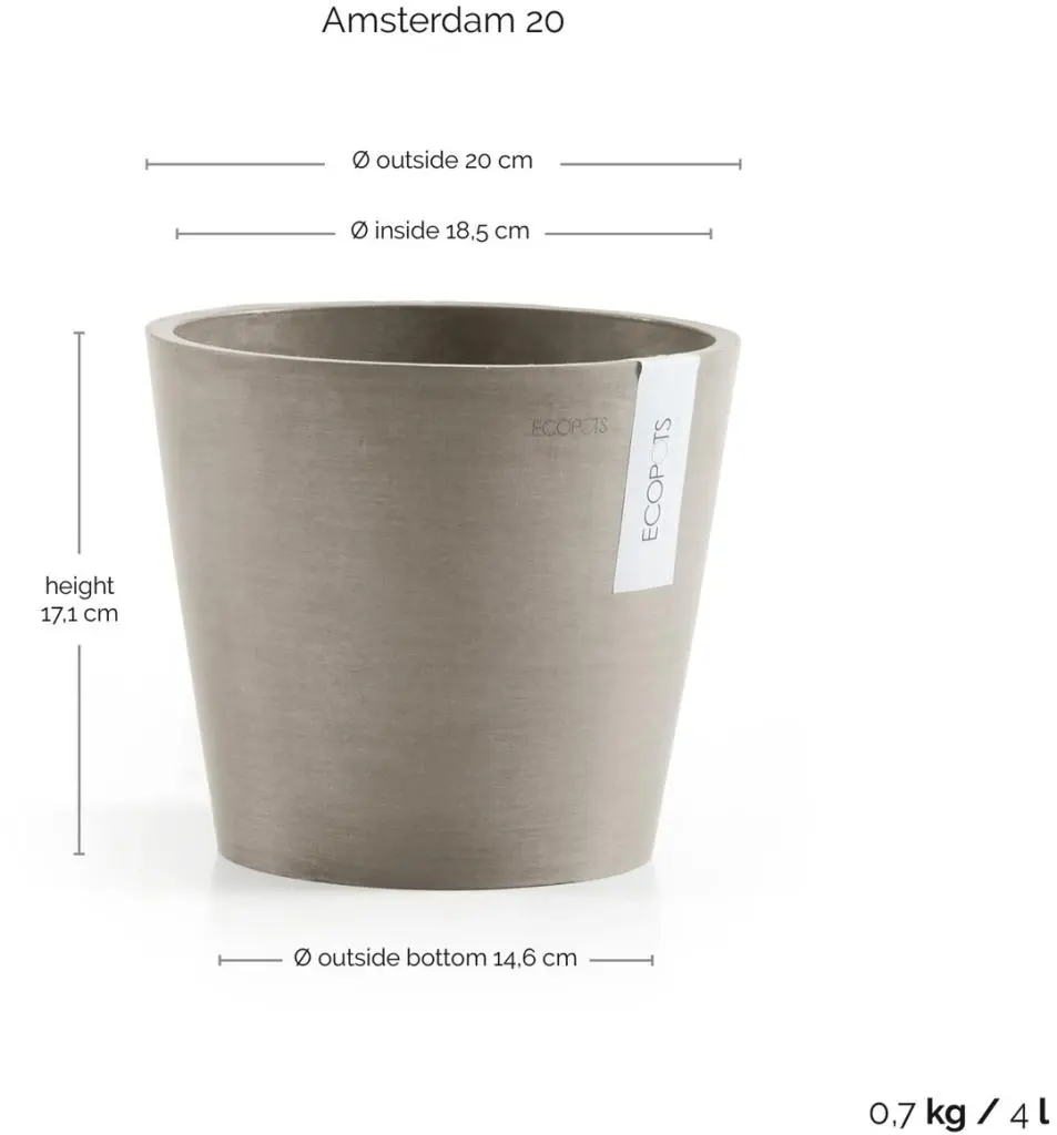 De Ecopots Amsterdam 20 (Taupe) is een kleine ronde bloempot die warmte en eenvoud uitstraalt. Ideaal voor kleine planten of kruiden op tafel of vensterbank. Lichtgewicht, sterk en duurzaam.