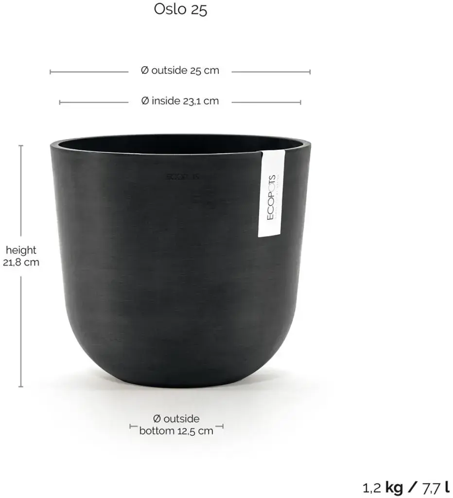 De Ecopots Oslo 25 (Donker Grijs) is een compacte bloempot met Scandinavisch geïnspireerd design. De donkergrijze kleur geeft een stoere, moderne uitstraling. Ideaal voor kleinere planten en kruiden, zowel binnen als buiten.
