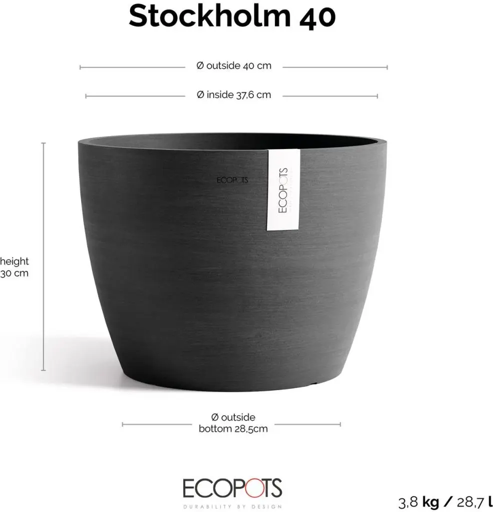 De Ecopots Stockholm 40 in Dark Grey combineert een robuuste look met veel ruimte voor wortelgroei. De natuurlijke, steenachtige uitstraling past in elke setting. Ideaal voor grotere kamer- en terrasplanten.