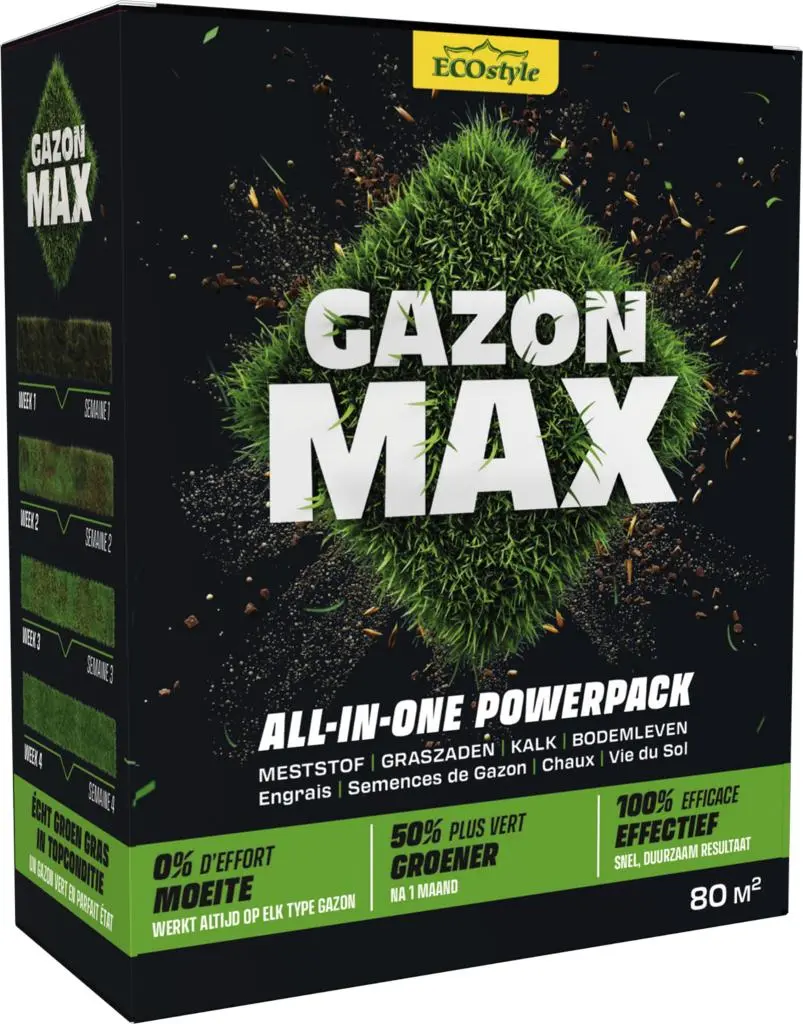 Volgens de productinformatie zorgt GazonMax voor een 50% groener gazon na 1 maand. Daarmee is het een praktische keuze voor wie het gazon in één behandeling wil voeden en tegelijk wil werken aan een dichtere en groenere grasmat.
