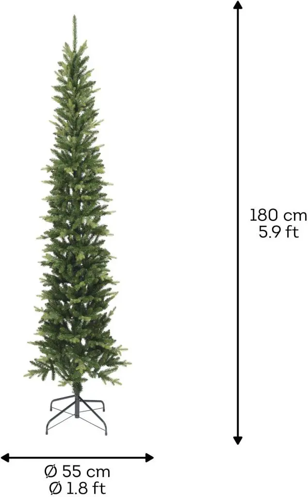 De hoogte van deze kunstkerstboom is 1,8 m, wat het een ideale grootte maakt voor de meeste woonruimtes. Met een diameter van 55 cm biedt de boom voldoende ruimte voor al je geliefde kerstversieringen, zonder te overweldigend te zijn.
