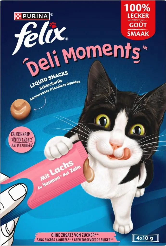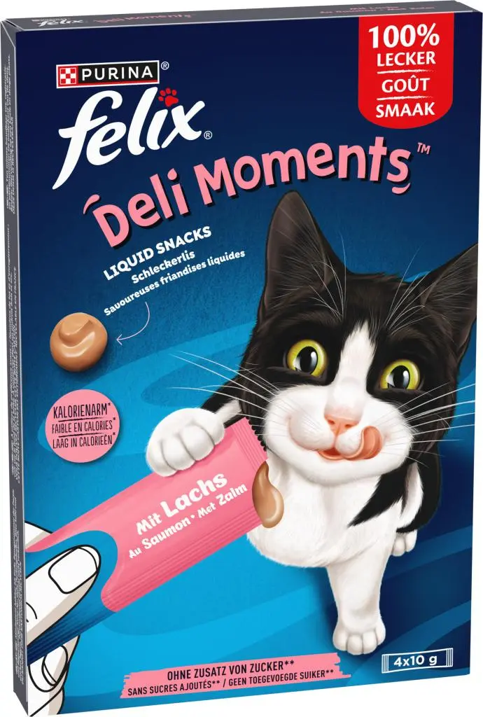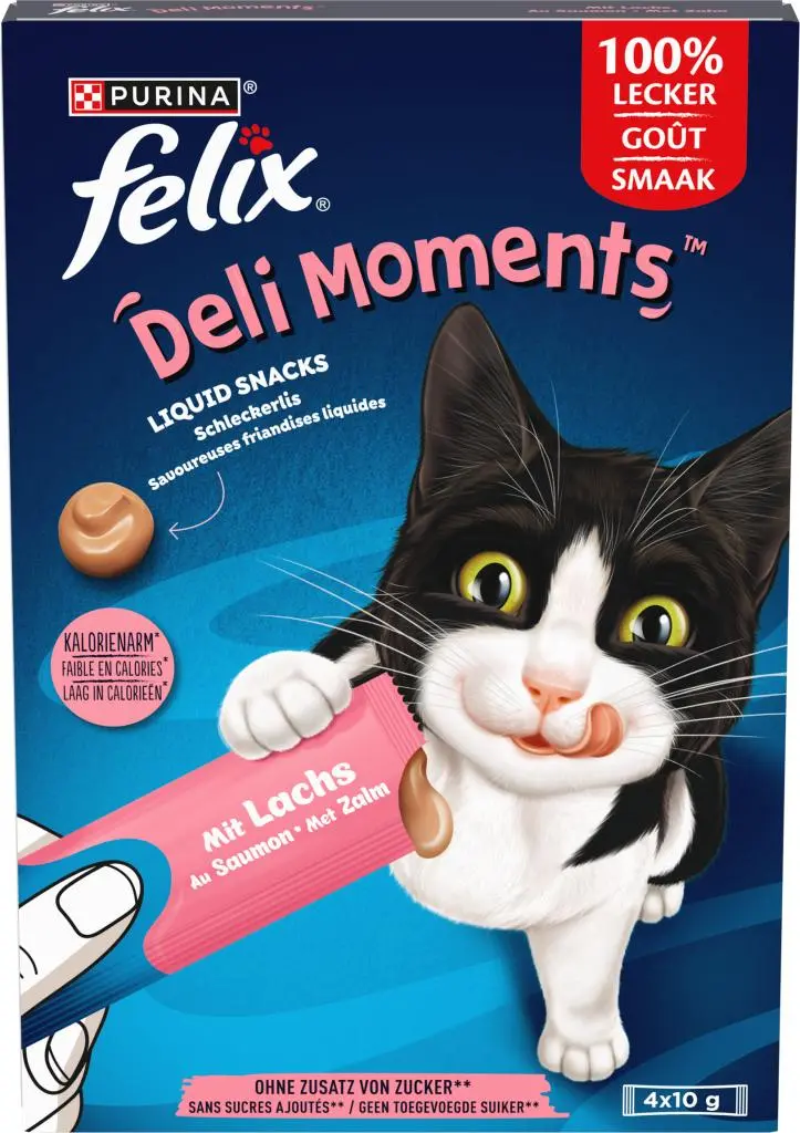 Maak kennis met een plezierige en leuke manier om je kat een snack te geven! De NIEUWE liquid snacks FELIX® Deli Moments™ hebben een onweerstaanbare smaak en romige textuur voor een ultiem genietmoment met je kat. Dankzij de dikke en zachte textuur zal het langer duren voordat je kat het opeet. Klaar om in te spelen op het eigen karakter en wens van je kat of het speciale moment, deze snacks met zalm zijn handig om te geven en gemakkelijk voor je kat om te eten. Een onweerstaanbare smaakbeleving die goed voelt om te geven en die weinig calorieën en geen toegevoegde suiker bevat. FELIX® Deli Moments™ zijn verkrijgbaar in een zakje van 10g in de smaak waar katten van houden: Zalm. FELIX® Deli Moments™: de snacks die langdurig smaakgenot bieden voor je kat door een interactieve traktatie. Probeer het vandaag nog voor een langer genietmoment samen met je deugniet!