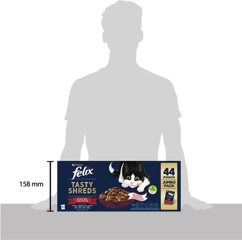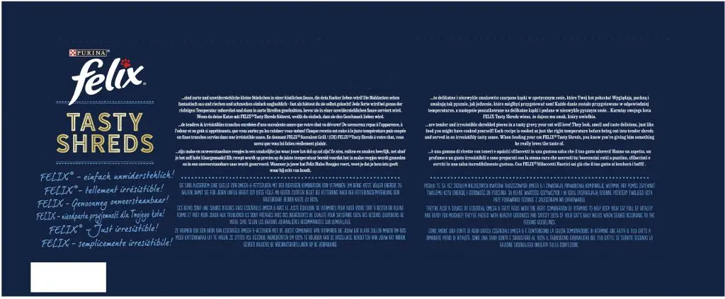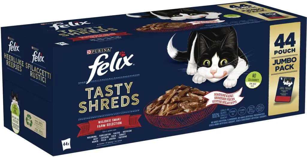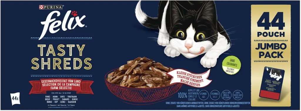Felix Heerlijke Reepjes zijn malse en onweerstaanbare reepjes in een smakelijke jus waar jouw kat dol op zal zijn! Ze zien, ruiken en smaken heerlijk, net alsof je het zelf hebt klaargemaakt! Wanneer je jouw kat Felix Heerlijke Reepjes voert, weet je dat je hem iets geeft waar hij echt van houdt. Elk recept wordt precies op de juiste temperatuur bereid voordat het in malse reepjes wordt gesneden en in een onweerstaanbare saus wordt geserveerd. Ze vormen ook een bron van essentiele omega 6 vetzuren met de juiste combinatie van uitgebalanceerde vitaminen die jouw kat klaar zullen maken om nog meer kattenkwaad uit te halen. Ze zitten vol gezonde ingredienten om 100% te voldoen aan de dagelijkse behoeften van jouw kat indien gevoed volgens de voedingsrichtlijnen op de verpakking.