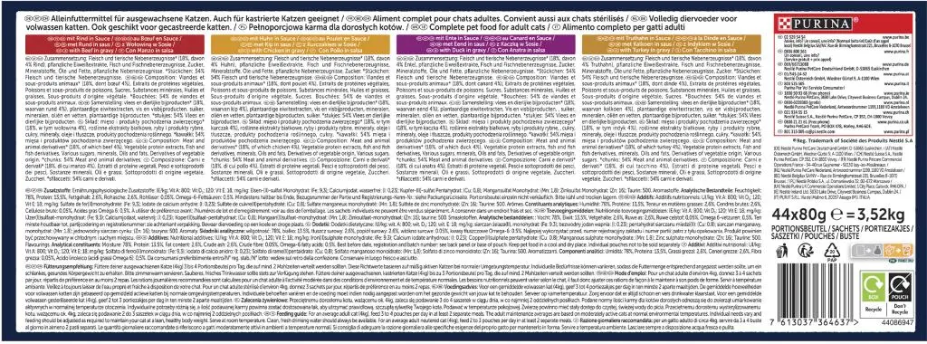 Samenstelling: met Rund: Vlees en dierlijke bijproducten*(18%, waarvan rund 4%), Plantaardige eiwitextracten,Vis en visbijproducten, Mineralen, Oliën en vetten, Plantaardige bijproducten, Suiker. *stukjes: 54% vlees en dierlijke bijproducten. Met Kip: Vlees en dierlijke bijproducten*(18%, waarvan kip 4%), Plantaardige eiwitextracten,Vis en visbijproducten, Mineralen, Oliën en vetten, Plantaardige bijproducten, Suiker. *stukjes: 54% vlees en dierlijke bijproducten. Met Eend: Vlees en dierlijke bijproducten*(18%, waarvan eend 4%), Plantaardige eiwitextracten,Vis en visbijproducten, Mineralen, Oliën en vetten, Plantaardige bijproducten, Suiker. *stukjes: 54% vlees en dierlijke bijproducten. Met Kalkoen: Vlees en dierlijke bijproducten*(18%, waarvan kalkoen 4%), Plantaardige eiwitextracten,Vis en visbijproducten, Mineralen, Oliën en vetten, Plantaardige bijproducten, Suiker. *stukjes: 54% vlees en dierlijke bijproducten