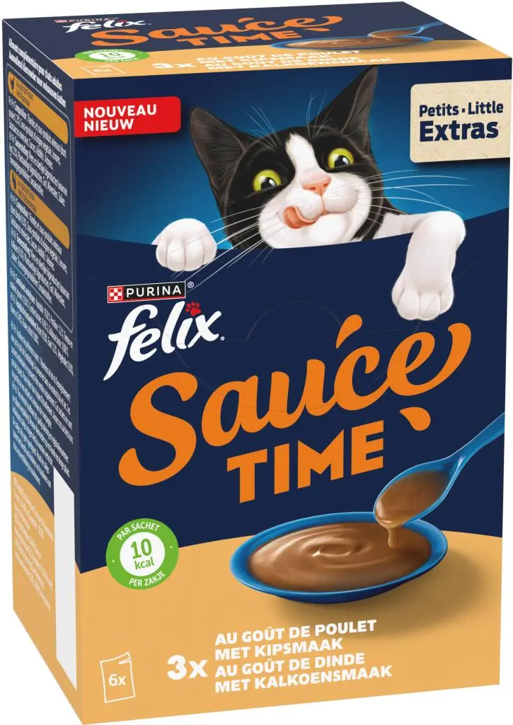 FELIX Sauce Time met Kip- en Kalkoensmaak is een geweldige manier om jouw kat een heerlijk extraatje natvoer te geven zodat hij klaar is voor kattenkwaad! Jouw kat zal smullen van deze onweerstaanbaar lekkere, smeuïge saus. Met elk schenkklaar zakje, voeg je heerlijke afwisseling toe op elk moment van de dag of tussen maaltijden door.FELIX Sauce Time is gemaakt van hoogwaardige ingrediënten en met maar 10 kcal per portiezakje is het de perfecte manier om jouw kleine deugniet te verwennen! FELIX - Gewoonweg onweerstaanbaar!
