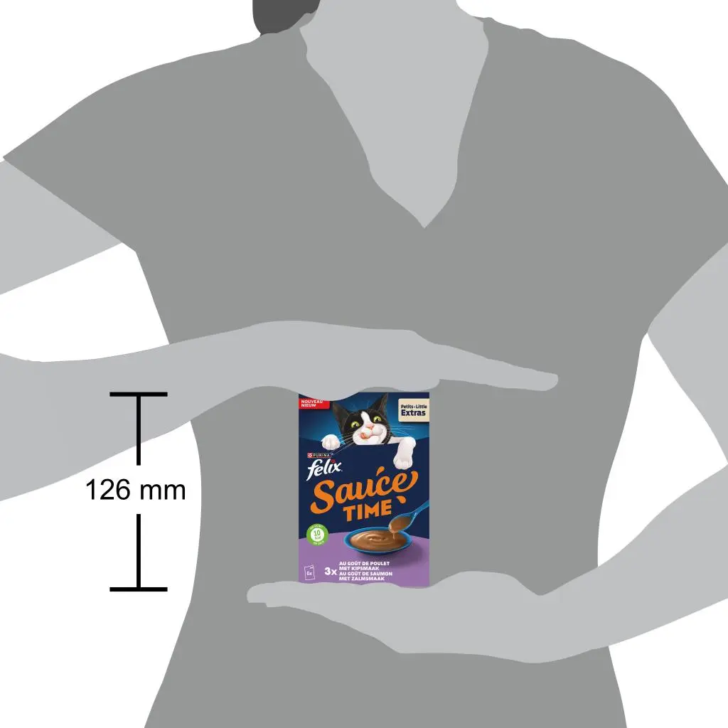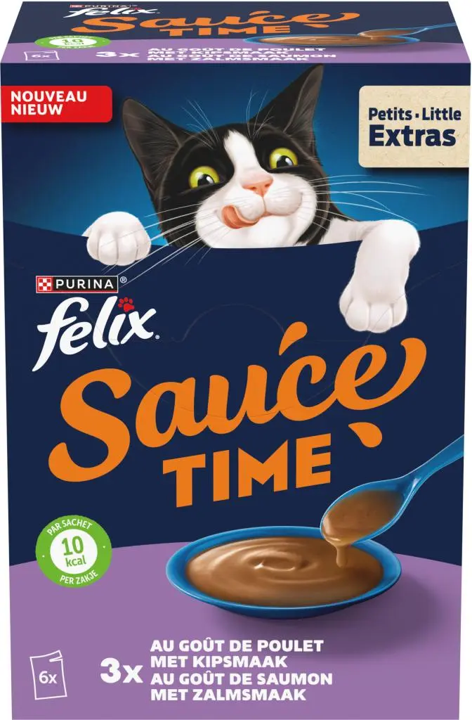 FELIX Sauce Time met Kip- en Zalmsmaak is een geweldige manier om jouw kat een heerlijk extraatje natvoer te geven zodat hij klaar is voor kattenkwaad! Jouw kat zal smullen van deze onweerstaanbaar lekkere, smeuïge saus. Met elk schenkklaar zakje, voeg je heerlijke afwisseling toe op elk moment van de dag of tussen maaltijden door.FELIX Sauce Time is gemaakt van hoogwaardige ingrediënten en met maar 10 kcal per portiezakje is het de perfecte manier om jouw kleine deugniet te verwennen! FELIX - Gewoonweg onweerstaanbaar!