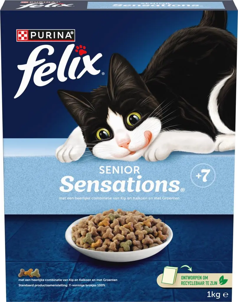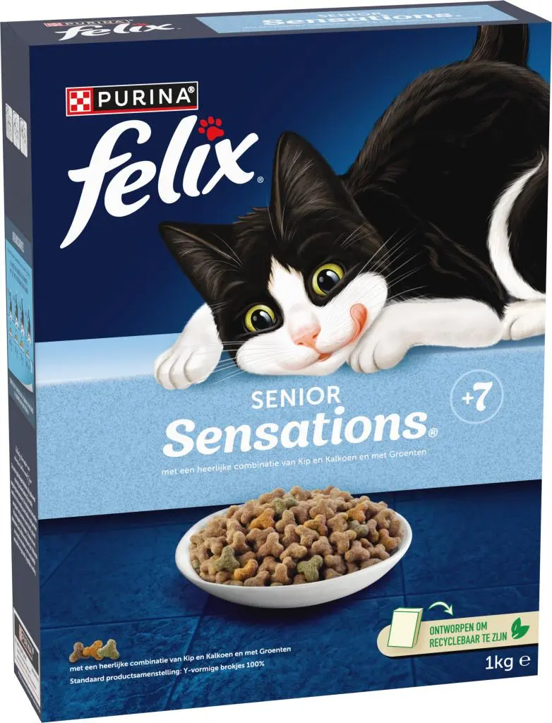 FELIX® Senior Sensations® maaltijden zien, ruiken en smaken natuurlijk heerlijk voor jouw kat. Iedere maaltijd is speciaal ontwikkeld voor katten van 7 jaar en ouder, en zit boordevol heerlijke, knapperige vormen en sensationele smaken.