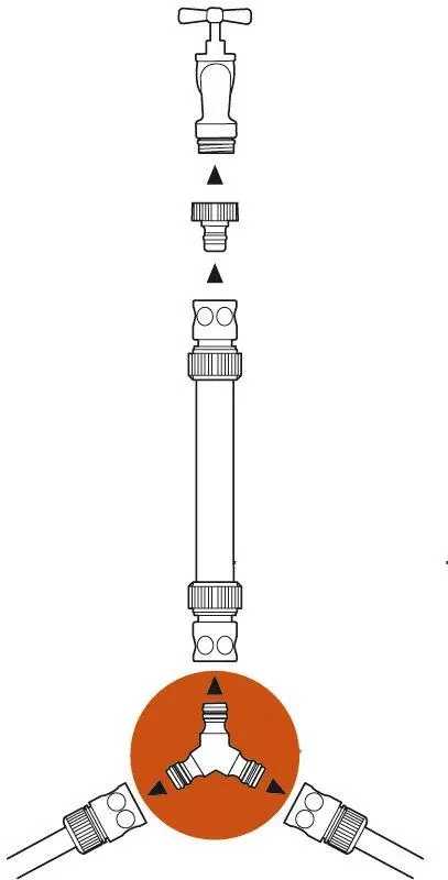 Een bekend probleem. Eén waterbron beschikbaar en u wilt twee sproeiapparaten tegelijk gebruiken. Door een 3-wegstuk te gebruiken, kunt u de tuinslang eenvoudig splitsen. U kunt dan met een sproeier het gazon besproeien en tegelijkertijd met een broes de bloembedden water geven. Het 3-wegstuk is geschikt om van een 19 mm (3/4") slang over te gaan op 13 mm (1/2") slangen.