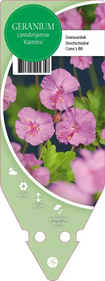 De vaste plant Geranium Cantabrigiense Karmina (Ooievaarsbek) is een bodembedekker. Plant de Geranium Cantabrigiense Karmina op een plek met zon, halfschaduw en plaats maximaal 7 planten per vierkante meter. Deze plant heeft een maximale hoogte van 30 cm als volwassen plant. De bloemkleur is roze.