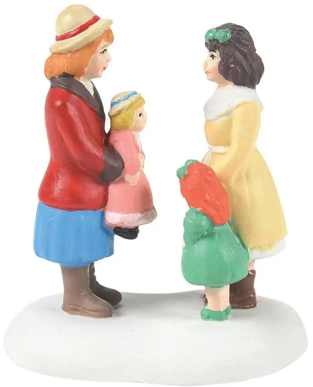 Twee lieve meisjes die vol trots hun nieuwe poppen laten zien, als onderdeel van de Dickens' Village-collectie van Department 56.