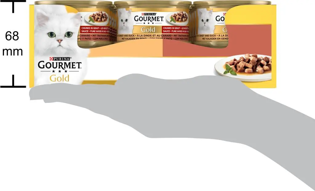 Gourmet Gold Fijne Hapjes met kalkoen en eend is een smaakvolle natvoeding die speciaal is ontwikkeld voor volwassen katten. In elk blikje van 85 gram vind je malse stukjes vlees in een verfijnde saus, waardoor je kat kan genieten van een zachte structuur en een rijke smaakcombinatie. De hoogwaardige ingrediënten zorgen voor een pure, smakelijke maaltijd die afgestemd is op de natuurlijke voorkeuren van katten.