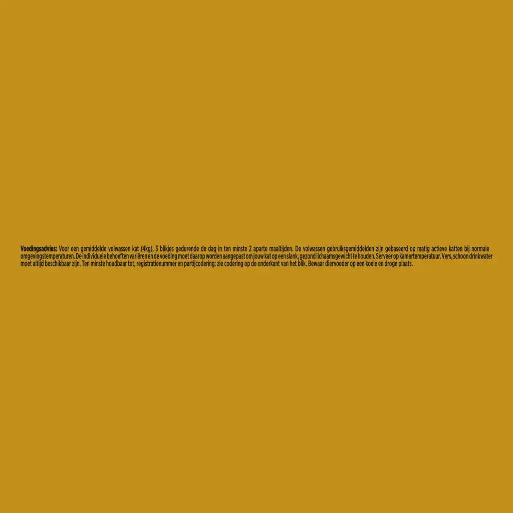Voor een gemiddelde volwassen kat van 4 kg wordt aanbevolen om dagelijks **3 blikjes** te geven, verdeeld over minimaal twee maaltijden. Zorg altijd voor voldoende schoon drinkwater. Met Gourmet Gold Malse Lekkernijen – Kip 85 g bied jij jouw kat een heerlijke, complete en smaakvolle maaltijd.