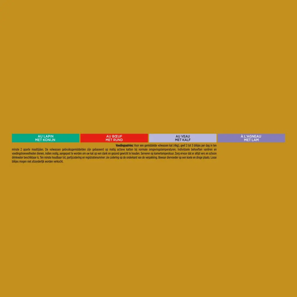 Samenstelling: met Konijn: Vlees en dierlijke bijproducten (58% waarvan konijn 4%), mineralen, plantaardige bijproducten, suiker. Met Rund: vlees en dierlijke bijproducten (57% waarvan rund 4%), mineralen, plantaardige bijproducten, suiker. Met Kalf: vlees en dierlijke bijproducten (58% waarvan kalfsvlees 4%), mineralen, plantaardige bijproducten, suiker. Met Lam: vlees en dierlijke bijproducten (56% waarvan lam 4%), mineralen, plantaardige bijproducten, suiker.
