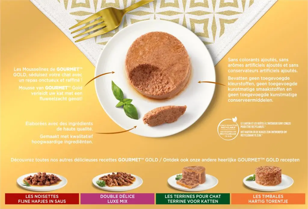 GOURMET Gold Mousse: zachte mousse met konijn, kip, zalm of niertjes, zorgvuldig bereid kattenvoer om jouw kat te plezieren met een delicate en zachte sensatie. Alle GOURMET Gold recepten natvoer zijn gemaakt met kwalitatief hoogwaardige ingrediënten en bevatten geen toegevoegde kleurstoffen, geen toegevoegde kunstmatige smaakstoffen en geen toegevoegde kunstmatige conserveermiddelen.