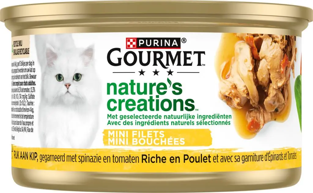 Geef je kat een verfijnde maaltijd geïnspireerd door de natuur met Gourmet Nature’s Creations Kip, Spinazie & Tomaten. Deze zorgvuldig samengestelde natvoeding bestaat uit langzaamgegaarde mini-filets van kip, verrijkt met spinazie en tomaten. De hoogwaardige, natuurlijke ingrediënten zorgen voor een heerlijke, pure smaakbeleving die zelfs de meest veeleisende fijnproever weet te overtuigen.