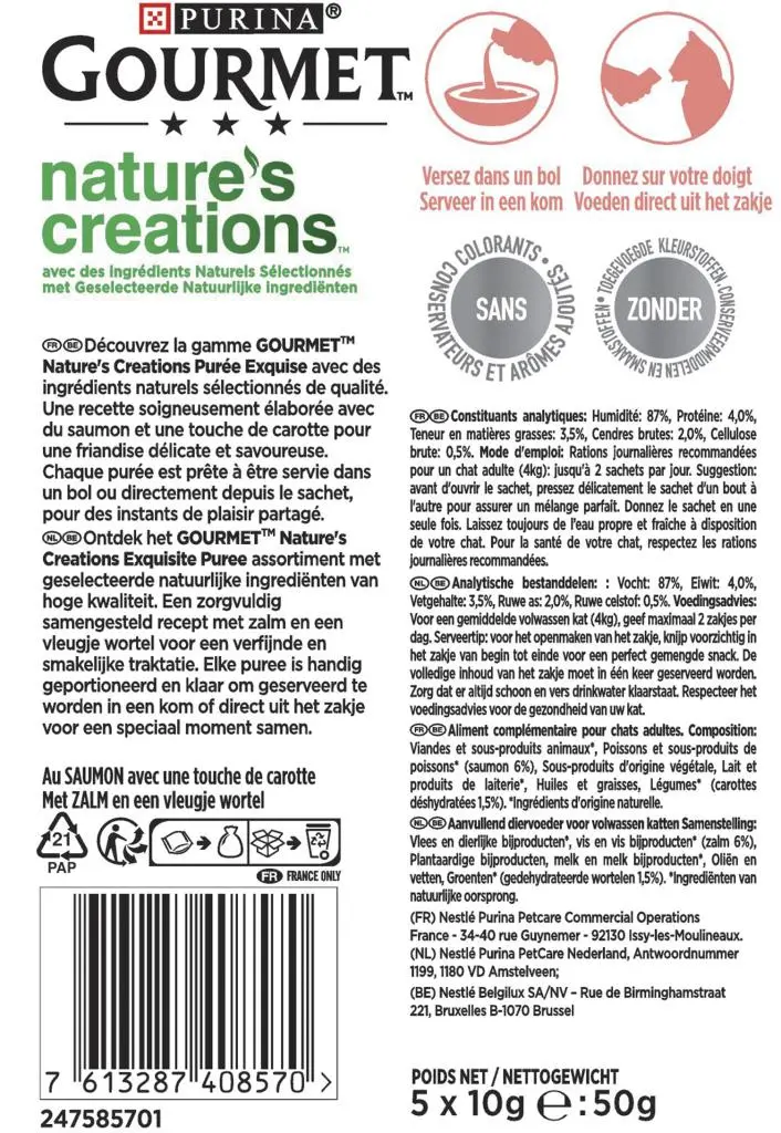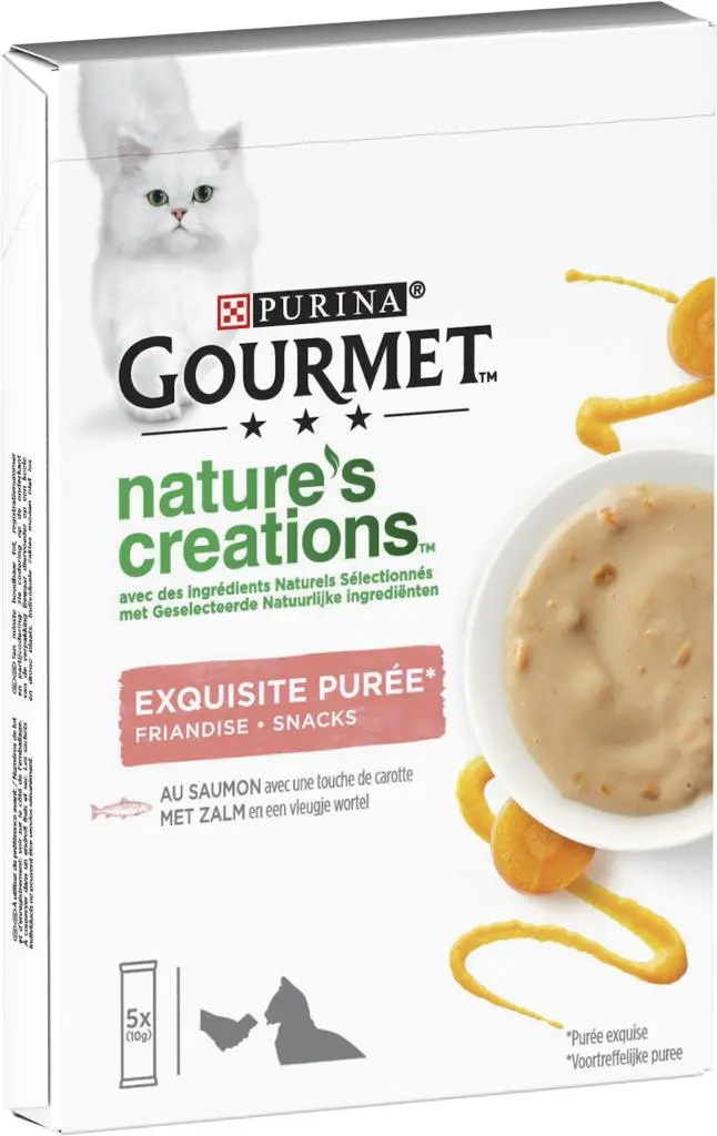 Ontdek GOURMET Nature's Creations Puree met geselecteerde natuurlijke ingrediënten van hoge kwaliteit, voor een smakelijke kattensnack tussen de maaltijden door. Een zorgvuldig samengesteld recept met kip en een vleugje pompoen voor een verfijnde en smakelijke traktatie waar uw kat met plezier van zal genieten. Elke puree is handig geportioneerd en klaar om geserveerd te worden in een kom of direct uit het zakje voor een speciaal moment samen.