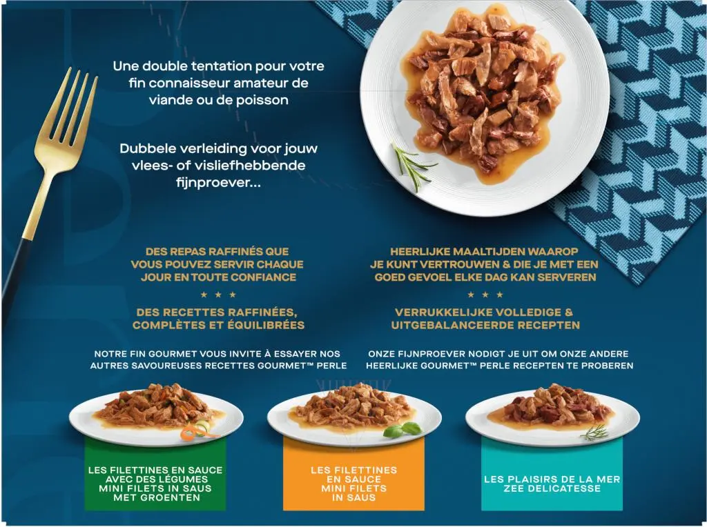 - Zorgvuldig geselecteerde combinatie van voortreffelijke mini filets, met zorg samengesteld en geserveerd in een verrukkelijke saus om de verfijnde smaak van je kat te verwennen.Dubbele verleidingen voor je vleesof visliefhebbende fijnproever...