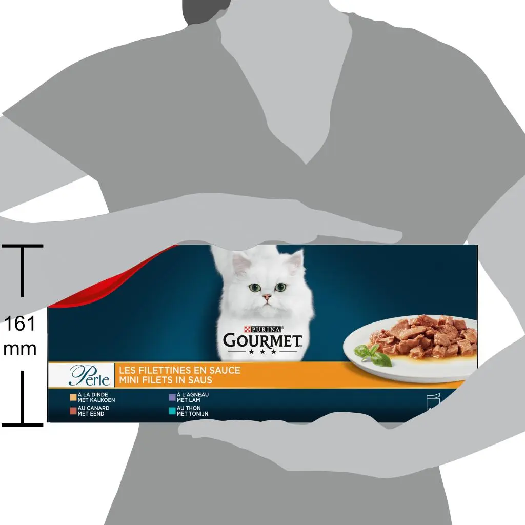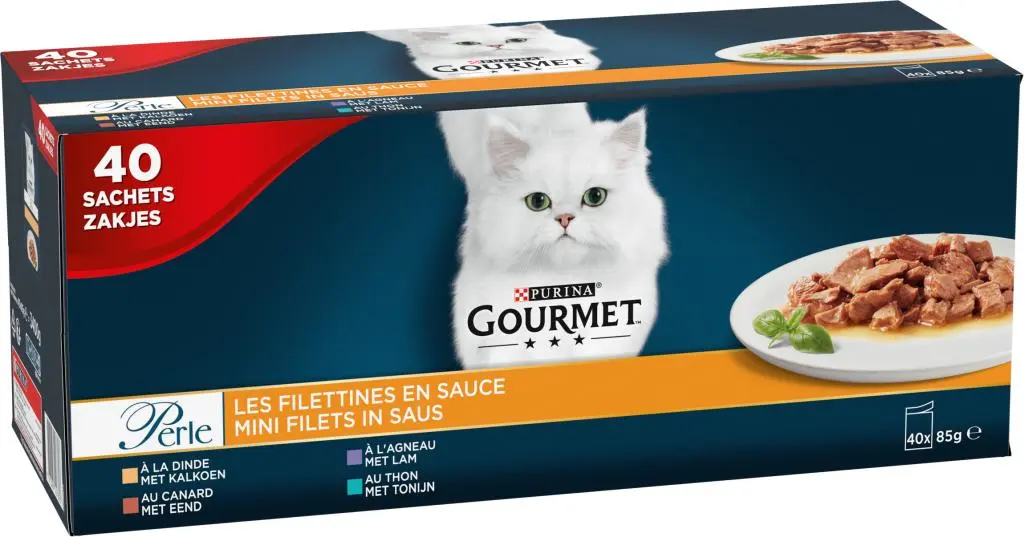 GOURMET™ Perle Mini Filets in Saus Mini filets met eend, lam, tonijn, kalkoenen geserveerd in een heerlijke saus om uw kat te verwennen. Alle GOURMET™ PERLE Mini Filets in Saus recepten zijn gemaakt van kwalitatief hoogwaardige ingrediënten en bevatten geen toegevoegde kleurstoffen, geen toegevoegde kunstmatige smaakstoffen en geen toegevoegde kunstmatige conserveermiddelen. Mini Filets in Saus van GOURMET™ Perle, eenvoudige en verfijnde creaties voor een onweerstaanbare smaakervaring, elke dag opnieuw.