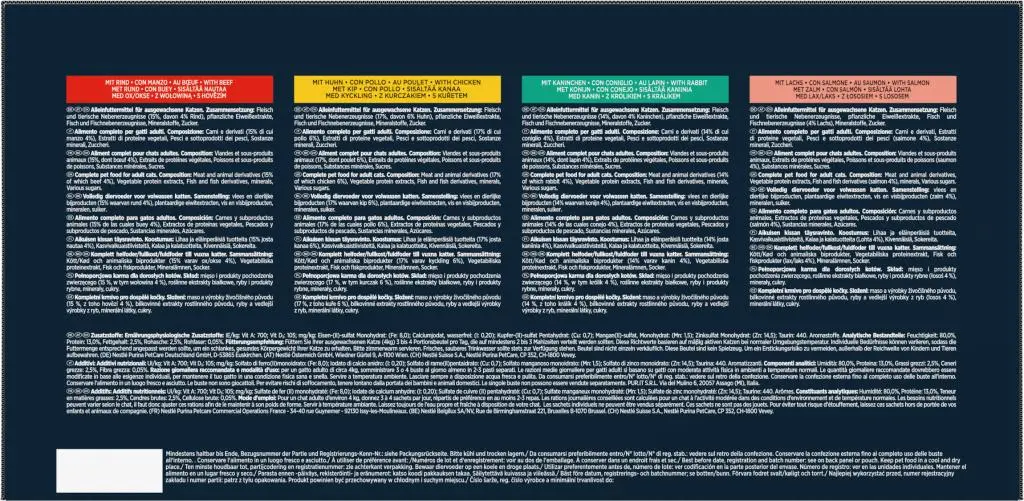 Samenstelling: met Konijn: Vlees en dierlijke bijproducten (14% waarvan konijn 4%), plantaardige eiwitextracten, vis en visbijproducten, mineralen, suiker. met Rund: Vlees en dierlijke bijproducten (15% waarvan rund 4%), plantaardige eiwitextracten, vis en visbijproducten, mineralen, suiker. met Kip: Vlees en dierlijke bijproducten (17% waarvan kip 6%), plantaardige eiwitextracten, vis en visbijproducten, mineralen, suiker. met Zalm: Vlees en dierlijke bijproducten, plantaardige eiwitextracten, vis en visbijproducten (zalm 4%), mineralen, suiker.