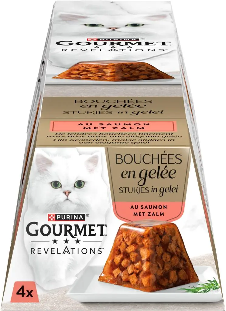 Maak kennis met GOURMET™ REVELATIONS™ Stukjes in Gelei. Luxe natvoer voor katten, perfect gevormd voor een heerlijke maaltijd voor uw kat. Elk recept uit deze collectie van sublieme delicatessen combineert een heldere, elegante gelei met verfijnde stukjes in elke hap. Deze heerlijke piramidevormige maaltijden zitten boordevol verrukkelijke smaken, klaar om de smaakpapillen van uw kat bij elke maaltijd te prikkelen. Deze verleidelijke collectie is verkrijgbaar in meerdere smaken. Vind de perfecte optie om het smaakpalet van uw kat te verwennen. GOURMET ™ REVELATIONS ™: Een sublieme delicatesse, prachtig geserveerd.