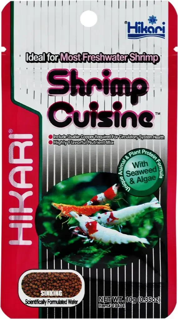 Hikari Shrimp Cuisine is plantaardig voer voor zoetwatergarnalen (Caridina en Neocaridina). Garnalen eten de hele dag door en zijn daarom zijn constant op zoek naar voedsel, ze eten vrijwel alles, afval en algen, garnalen zijn daarmee de schoonmakers van het aquarium. Maar om garnalen in topconditie te houden hebben ze vooral plantaardig voedsel nodig. Hikari Shrimp Cuisine is rijk aan plantaardige stoffen, vooral zeewier en spirulina.