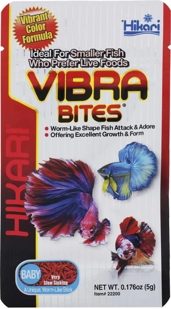 Hikari Vibra Bites is ontworpen om de vorm en beweging van levende rode muggenlarven na te bootsen. Het voer zinkt langzaam en beweegt door de stroming in het water zoals levend voer, dit lokt de vissen om te eten, de meeste vissen zijn gek op dit soort voer. Hikari Vibra Bites zorgt voor uitzonderlijke, briljante en levendige kleuren. Het voer kan gevoerd worden aan alle vissen die ook levend voer eten.