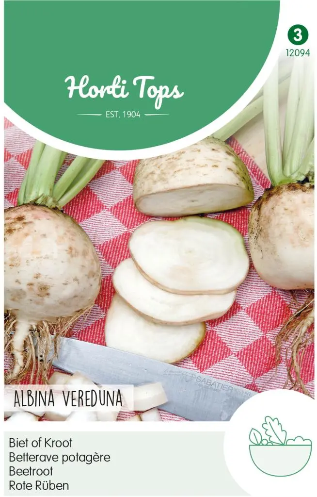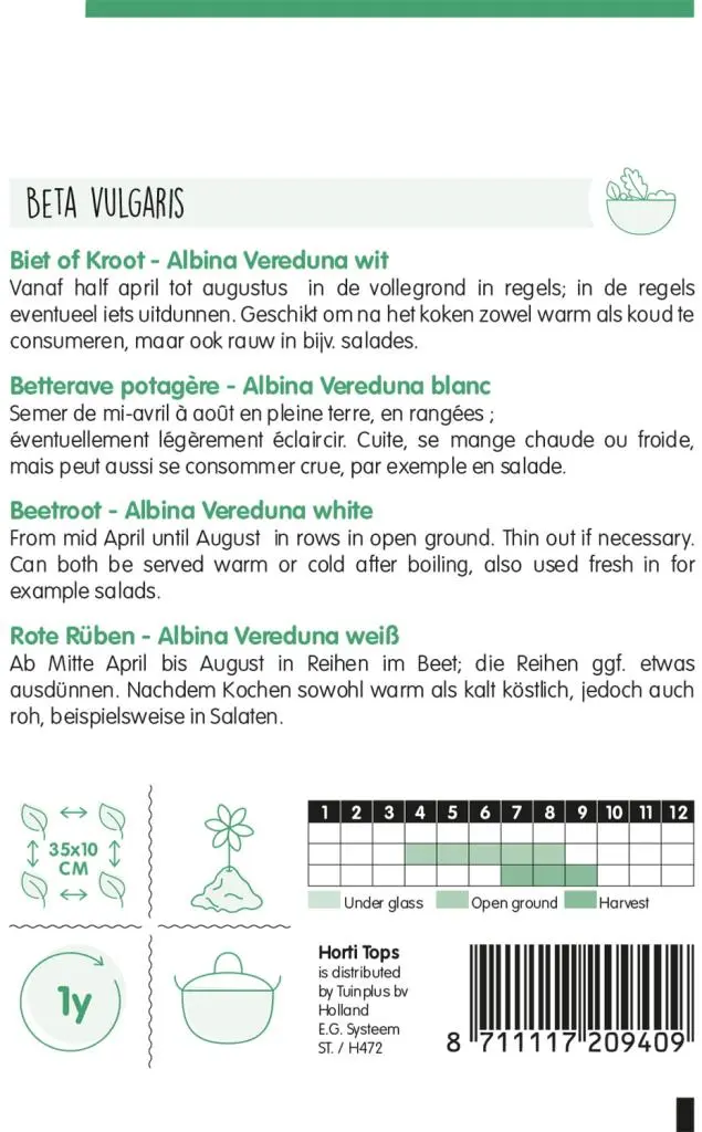 Biet of Kroot - Albina Vereduna wit Vanaf half april tot augustus in de vollegrond in regels; in de regels eventueel iets uitdunnen. Geschikt om na het koken zowel warm als koud te consumeren, maar ook rauw in bijv. salades.