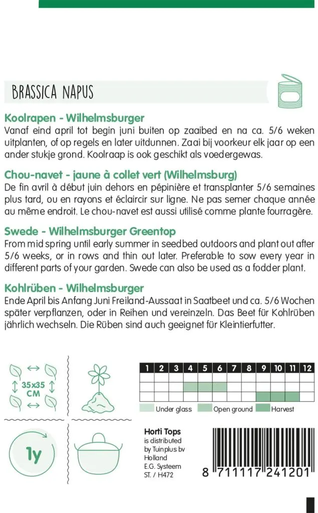 Koolrapen - Wilhelmsburger Vanaf eind april tot begin juni buiten op zaaibed en na ca. 5/6 weken uitplanten, of op regels en later uitdunnen. Zaai bij voorkeur elk jaar op een ander stukje grond. Koolraap is ook geschikt als voedergewas.