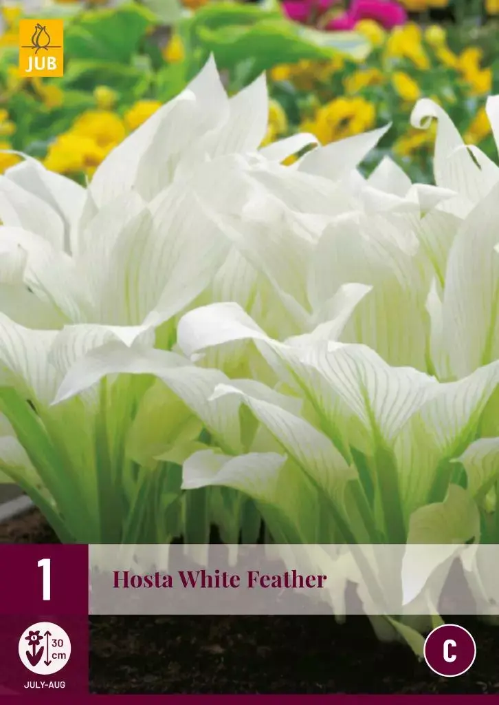 Hosta (hartlelie) 'White Feather' is een populaire plant. Dit komt vooral door het decoratieve blad. Deze plant is erg geschikt om in een ruime bloempot te planten. Het goed gevormde, ovale tot hartvormige blad is opvallend wit met groen van kleur. In de zomer verschijnen witte, bloemen langs de bloemstengels. De bloemen staan boven het blad en geven de plant ’s zomers extra sierwaarde.Hosta 'White Feather' is een prachtige bladplant die goed uitkomt in een bloempot of gewoon in de volle grond. Deze Hosta houd van een locatie met half schaduw tot schaduw.Geef uw Hosta 'White Feather' regelmatig water, de potkluit mag niet uitdrogen. Droge grond wordt slecht verdragen door de hartlelie. Knip de uitgebloeide bloemstengels aan het eind van de bloeiperiode weg. De hartlelie is goed winterhard. Verwijder in het voorjaar het afgestorven blad, al snel zult u weer de ‘neuzen’ van de nieuwe scheuten boven de grond zien komen.Hosta’s zijn ook heel fraai in de border tussen bloeiende vaste planten, zoals de Hemerocallis en Astilbes.