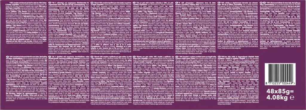 Samenstelling vlees en dierlijke bijproducten (42% waaronder 14% kip en 12% kalkoen), plantaardige bijproducten, mineralen. Vlees en dierlijke bijproducten (38% waaronder 4% lam), groenten (4% paprika, van gedroogde paprika), plantaardige bijproducten, mineralen. Vlees en dierlijke bijproducten (30%), vis en -bijprodukten (8% tonijn), groenten (4% doperwten, van gedroogde erwten), plantaardige bijproducten, mineralen. Vlees en dierlijke bijproducten (34%), vis en -bijprodukten (4% zalm, 4% kabeljauw), plantaardige bijproducten, mineralen.