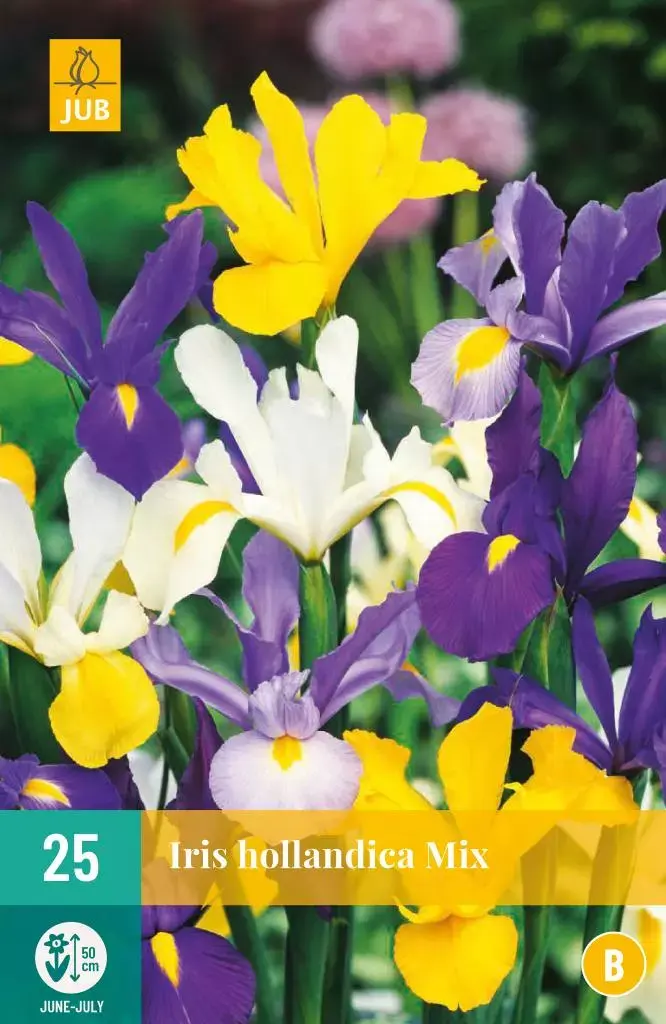 De Iris hollandica mix is een dankbare zomerbloeier die u veel plezier geeft. Iris hollandica bloeit in juni-juli. Iris hollandica wordt ongeveer 50 cm. hoog. Deze iris is daarom ook goed geschikt voor het planten in de border. Irisknollen kunt u in het voorjaar planten. Graaf een ruim plantgat, maak de aarde los en vul het plantgat met goede potgrond. Leg de knollen in het plantgat en dek af met 5 cm. aarde. De plantafstand van de knollen is 10-15 cm. Geef na het planten de knollen meteen wat water. Irissen bloeien het rijkst in de volle zon. Iris hollandica mix is goed te combineren met vaste planten en andere iris soorten. De gemengde bloemen zijn echte blikvangers in de border.Bewaar de knollen na de bloei op een vorstvrije plaats en u heeft er jarenlang plezier van.